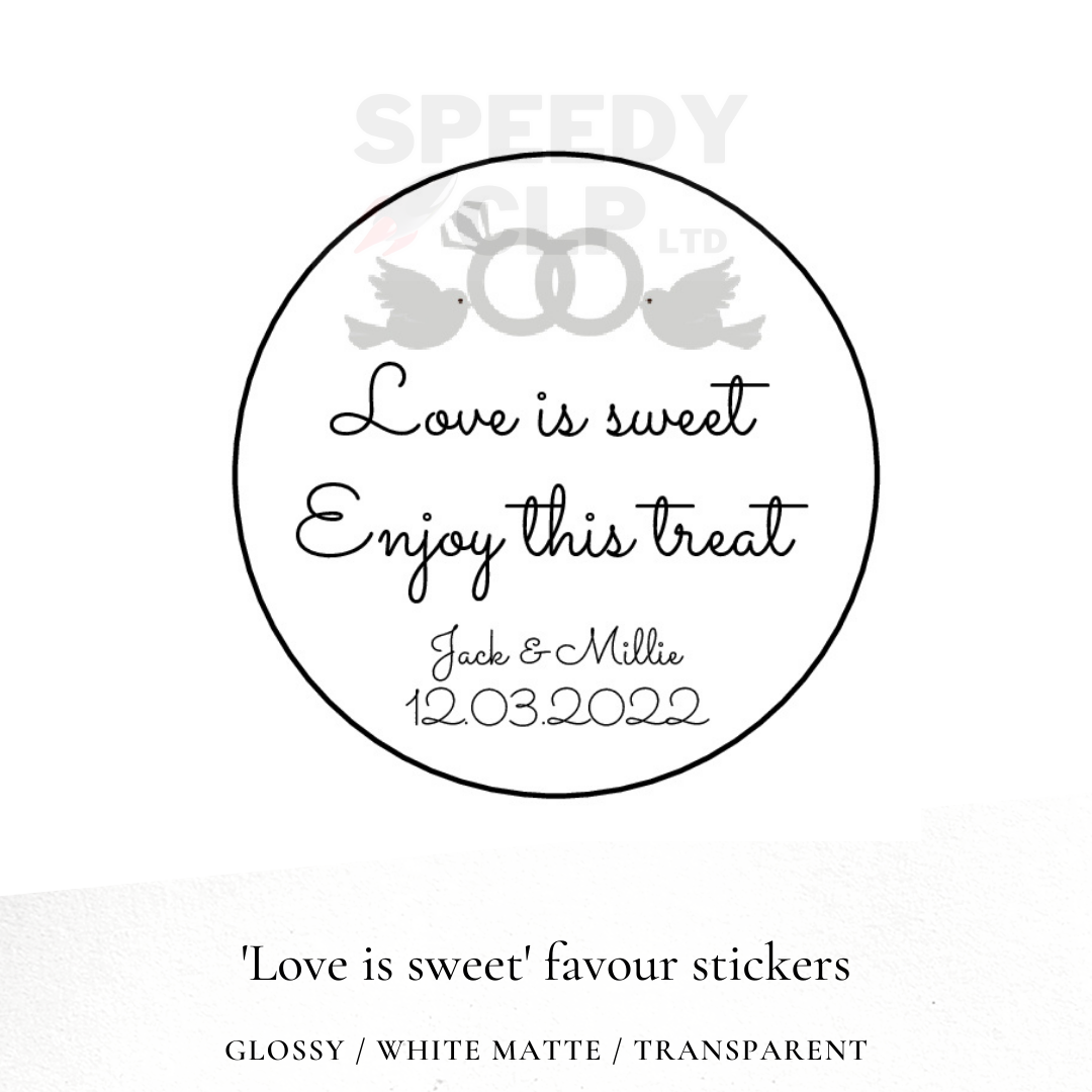 Customisable, 'Love is sweet, enjoy this treat', wedding day favour stickers, a perfect way to personalise favours for your guests at your wedding
